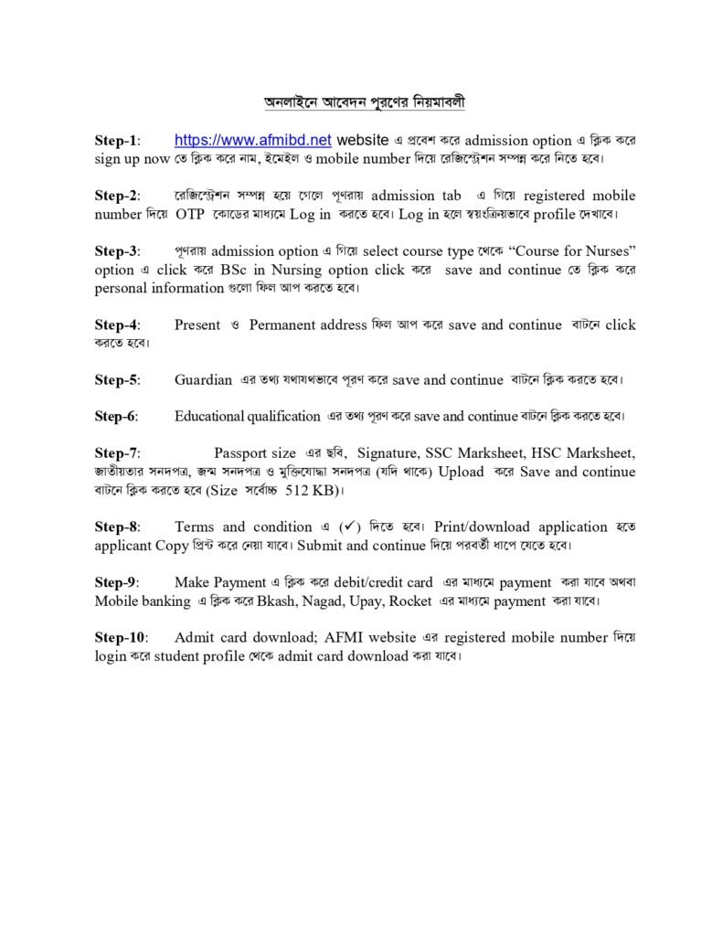 ১। ২০২৫-২০২৬ শিক্ষাবর্ষে এএফএমআই’তে ০৪ (চার) বছর মেয়াদী বিএসসি ইন নার্সিং কোর্সে (১৭তম ব্যাচ) ছাত্রী ভর্তি করা হবে।
