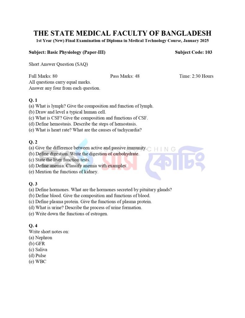 Basic Physiology (Paper-III) 1st Year (New) Final Examination of Diploma in Medical Technology Course, January 2025