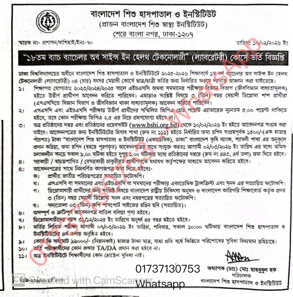 বাংলাদেশ শিশু হাসপাতাল ও ইনস্টিটিউট এ ভর্তি বিজ্ঞপ্তি ২০২৫-২৬ বিএসসি ইন ল্যাবরেটরি মেডিসিন