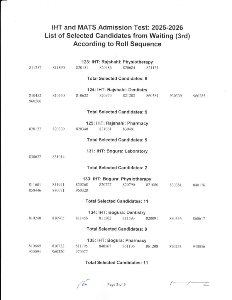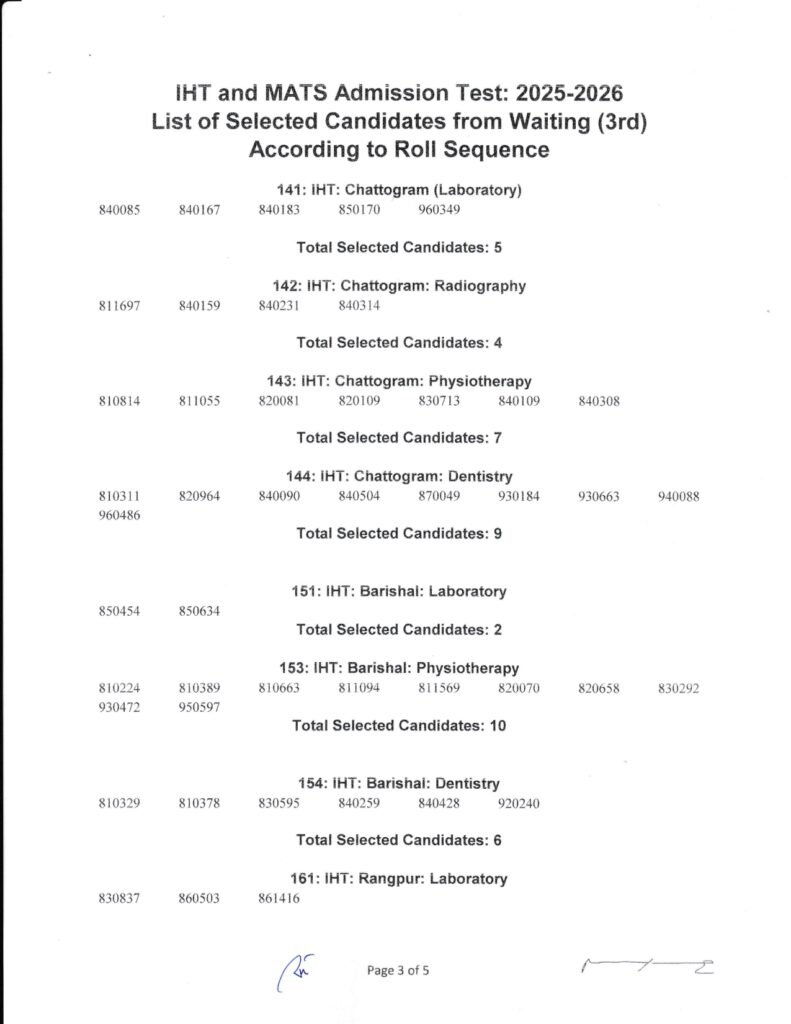 ২০২৫-২০২৬ খ্রি. শিক্ষাবর্ষে আইএইচটি ও ম্যাটসসমূহে যথাক্রমে ডিপ্লোমা ইন মেডিকেল টেকনোলজি এবং ডিপ্লোমা ইন মেডিকেল অ্যাসিস্ট্যান্ট কোর্সে শিক্ষার্থী ভর্তির লক্ষ্যে গত ২৪/১০/২০২৫ খ্রি. তারিখে অনুষ্ঠিত ভর্তি পরীক্ষার ফল ও এসএসসি/সমমান পরীক্ষায় প্রাপ্ত জিপিএ হতে নম্বর যোগ করে মেধা ও পছন্দ অনুযায়ী ৩য় ধাপ অপেক্ষমান তালিকা থেকে ফল প্রকাশ করা হলো। সংশ্লিষ্ট সরকারি আইএইচটি ও ম্যাটসসমূহে অপেক্ষমান তালিকাভুক্ত শিক্ষার্থীদের ০৩/০২/২০২৬ খ্রি. হতে ১৩/০২/২০২৬ খ্রি. পর্যন্ত নিজ নিজ প্রতিষ্ঠানসমূহে উপস্থিত হয়ে ভর্তি প্রক্রিয়া সম্পন্ন করতে হবে। ২৫/০২/২০২৬ খ্রি. তারিখের মধ্যে ভর্তি সংক্রান্ত যাবতীয় প্রক্রিয়া সম্পন্ন করতে হবে। সংশ্লিষ্ট কর্তৃপক্ষ কর্তৃক উপস্থিত শিক্ষার্থীদের সনদপত্র পরীক্ষা-নিরীক্ষা করবেন এবং গঠিত মেডিকেল বোর্ড তাদের স্বাস্থ্য পরীক্ষা করবে। কোনো শিক্ষার্থীর দাখিলকৃত সনদপত্রের মধ্যে ভুলত্রুটি পরিলক্ষিত হলে বা কোনো শিক্ষার্থী স্বাস্থ্য পরীক্ষায় অযোগ্য বলে বিবেচিত হলে তার প্রাথমিক নির্বাচন বাতিল বলে গণ্য হবে। এছাড়া ভর্তি পরবর্তী সময়ে কোনো শিক্ষার্থীর প্রদত্ত তথ্য ভুল/অসত্য প্রমাণিত হলে তার ভর্তি বাতিল বলে গণ্য হবে। ভর্তি পরীক্ষার ফল স্বাস্থ্য শিক্ষা অধিদপ্তরের ওয়েব সাইট www.dgme.gov.bd